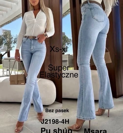 💞​Fason: Spodnie mają wysoki stan i są dopasowane na biodrach i udach, a od kolan w dół mocno się rozszerzają, tworząc charakterystyczny kształt „dzwonów”.